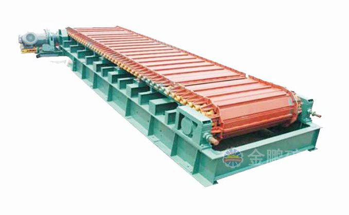 采用節距為150mm的高強度模鍛鏈條為牽引件,兩根鏈條繞過安裝在機體頭部的一對驅動鏈輪和機體尾部的一對張緊輪聯成封閉形回路,在兩排鏈條的每個鏈節上裝配了相互交迭的、輕型結構的輸送槽而成為一個連續的能夠運載物料的輸送線路。其自重和物料的重量由安裝在機體上的多排支重輪、鏈托輪和滑道梁支承。傳動系統經交流變頻調速電動機聯接減速機,再由漲套與驅動裝置直聯驅動運載機構低速運行。將尾部料倉卸入的物料沿輸送線路運至機體的前方排出,實現向下方的工作機械連續均勻喂料的目的。