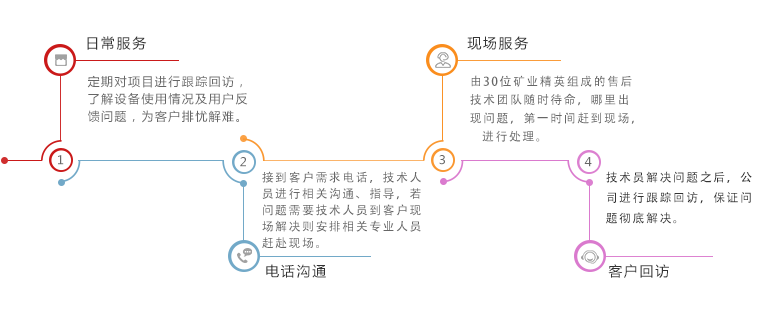除了制造礦山設備之外,金鵬集團還提供工程咨詢、選礦試驗研究、 礦山設計、設備制造、安裝調試、人員培訓、 長期跟蹤服務、選廠管理運營等一條龍服務,讓客戶全程無憂, 縮短工期,提早收益。